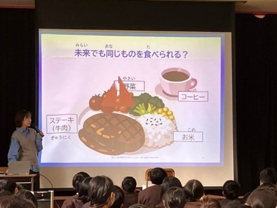 テーマは「未来でも同じものを食べられる?」とし、気候変動、ゴミ対策、食品ロスをキーワードに広く食の未来を考え、当社グループが扱うコーヒー、紅茶、野菜、水産品などを題材に4時限(2時限×2回)にわたり授業を行いました。前半は講義とクイズ形式で理解を深め、後半はコーヒーグラウンズ(抽出カス)と麻袋を使った消臭袋づくりを通じて、リサイクルの意義やコーヒーグラウンズの再利用について考える時間としました。