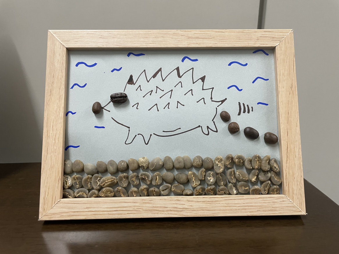 緑の生豆と茶色の焙煎豆、2種類の色のコーヒー豆を使用し子どもたちは思い思いに素敵な作品を完成させてくれました。