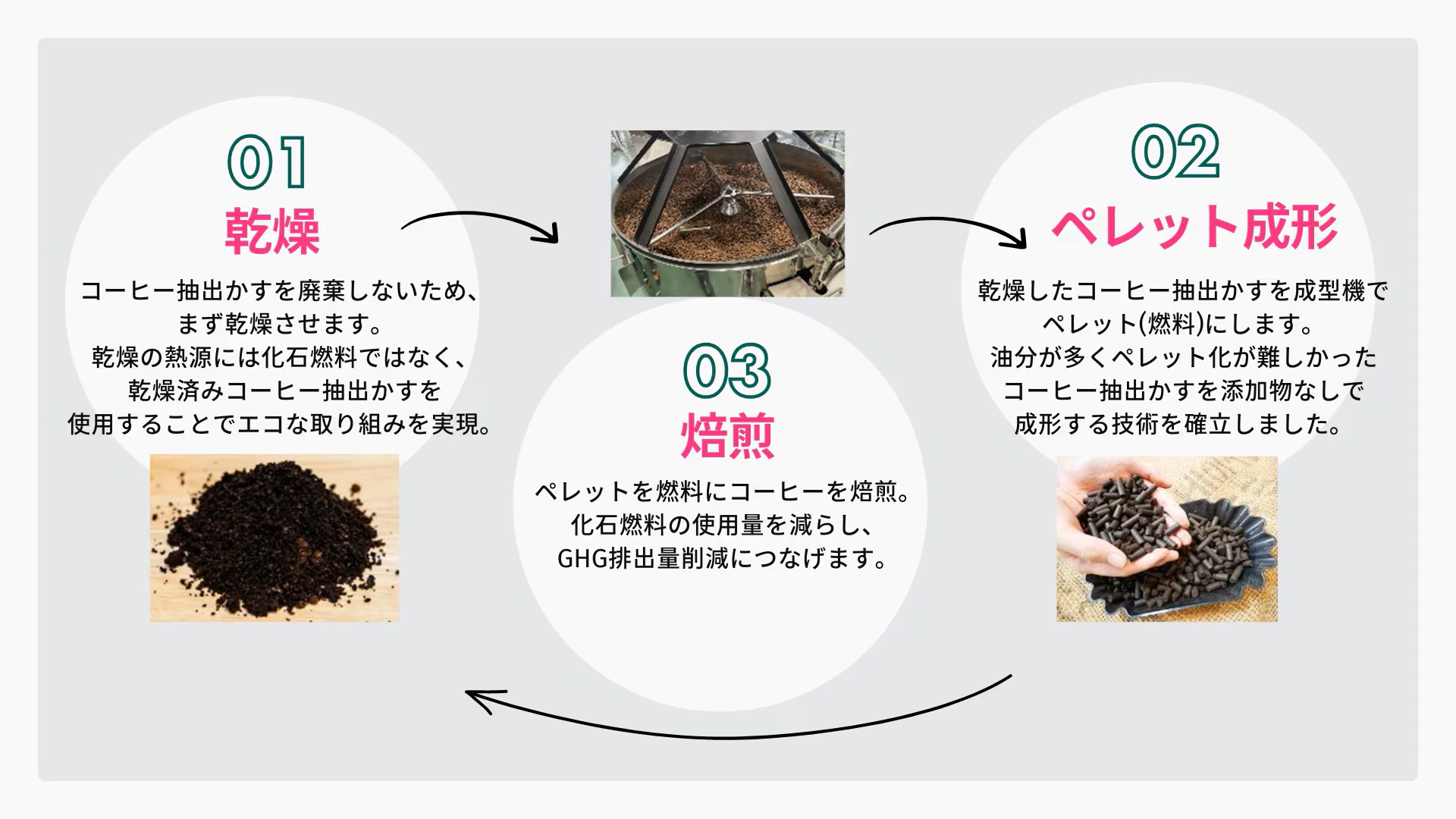 コーヒー抽出後の残渣(以下、コーヒーグラウンズ)に新たな命を吹き込み、廃棄物を価値へと変革するゼロウエストとGHG排出削減を実現させることに挑戦。環境省のプロジェクトで機器(コーヒーグラウンズを乾燥させる乾燥機、乾燥したコーヒーグラウンズをペレット状にする成型機、コーヒーペレットを燃料として使用できる焙煎機)を開発。廃棄物ゼロとGHG排出量削減を目指し、コーヒーグラウンズを乾燥させてペレット状の燃料に成型し、そのペレットを使用してコーヒーを再び焙煎する持続可能な取り組み=グリーン焙煎を実現しました。